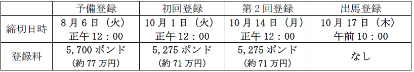 ※ イギリスの競走登録を担当しているウェザビーズ社(Weatherbys Ltd) への登録後に、同社から登録料の請求書が届きます。出走までには、上記登録の合計16,250ポンド(約219万円)および通常約4万円【詳細は請求書に記載: 英国競馬統轄機構(BHA)の手数料、アニマルヘルストラスト(AHT)、引退競走馬福利基金、付加価値税、騎手登録料(保険・税込)など】が掛かります。