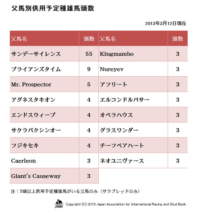 2013年の供用予定種雄馬名簿(2013年3月12日現在)がまとまりました。