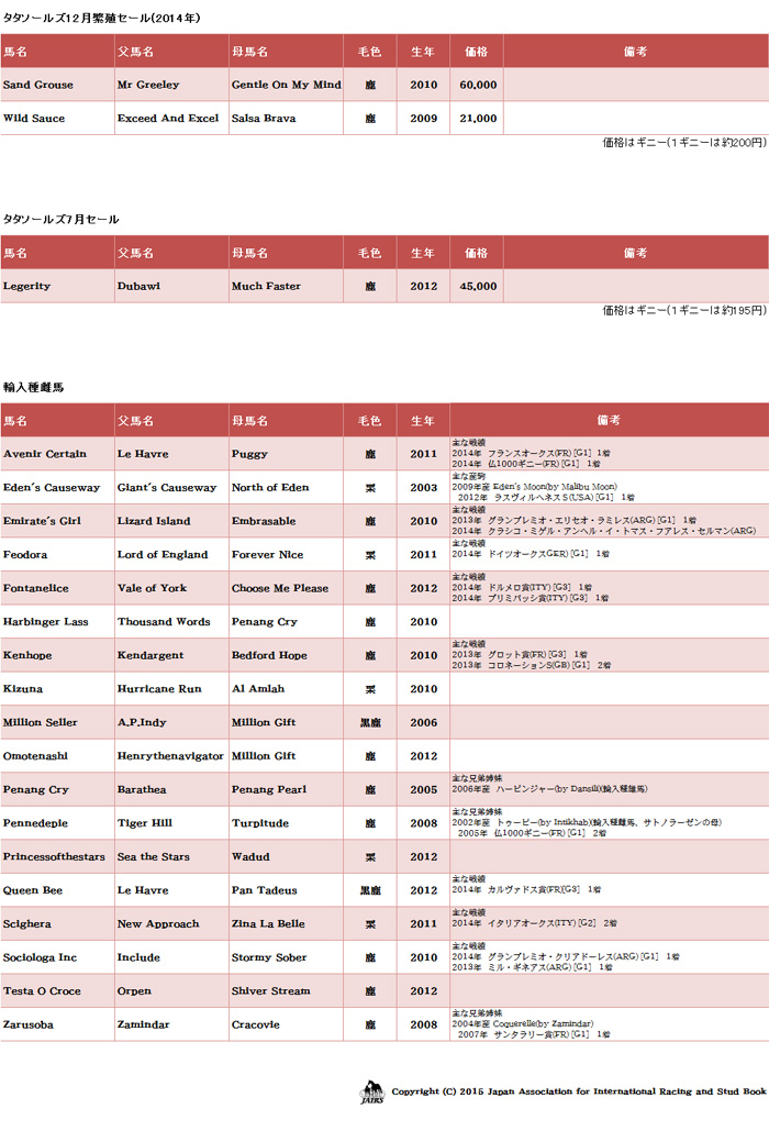 2014年のタタソールズ12月繁殖セールで購買された種雌馬2頭、タタソールズ7月セールで購買された種雌馬1頭、その他18頭の種雌馬が輸入されました。