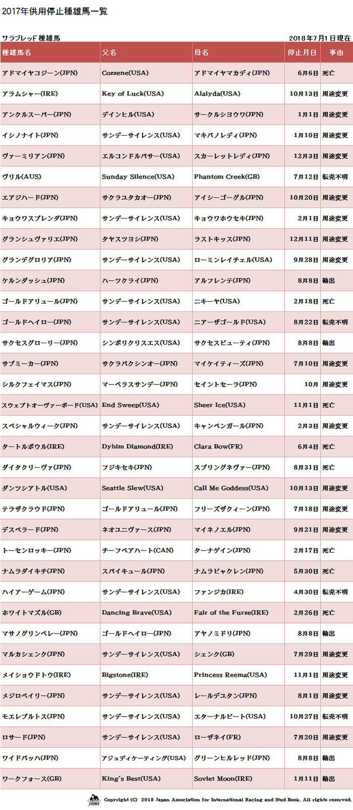 本財団に報告のあった2017年に供用停止された種雄馬は、2018年2月16日時点(2018年軽種馬登録ニュース No.14)で25頭でしたが、その後10頭の報告があり35頭になりました。