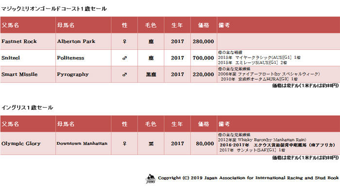 マジックミリオンゴールドコースト1歳セールで購買された競走馬3頭(雄2・雌1)、イングリス1歳セールで購買された競走馬1頭(雌1)の合計4頭が輸入されました。