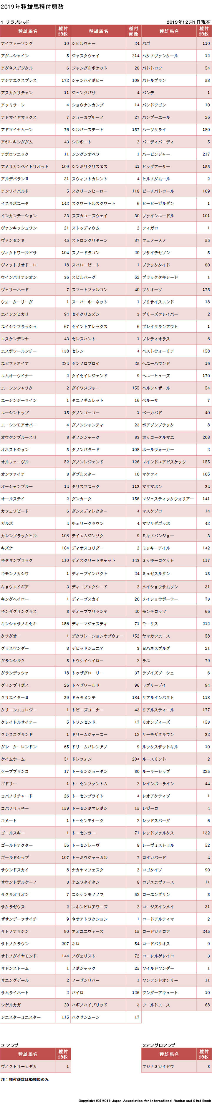 2019年の種付情報の公開と各種雄馬の種付頭数