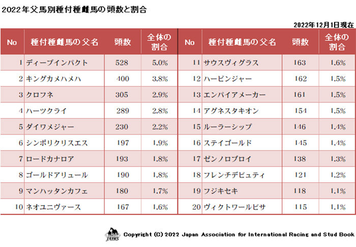 種付種雌馬の父で一番多い種雄馬は、ディープインパクトの528頭で全体の5.0%となります。
