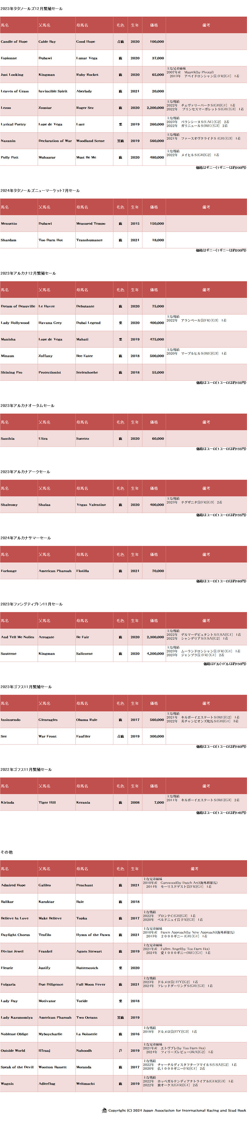 2024年アルカナサマーセールで購買された種雌馬1頭、