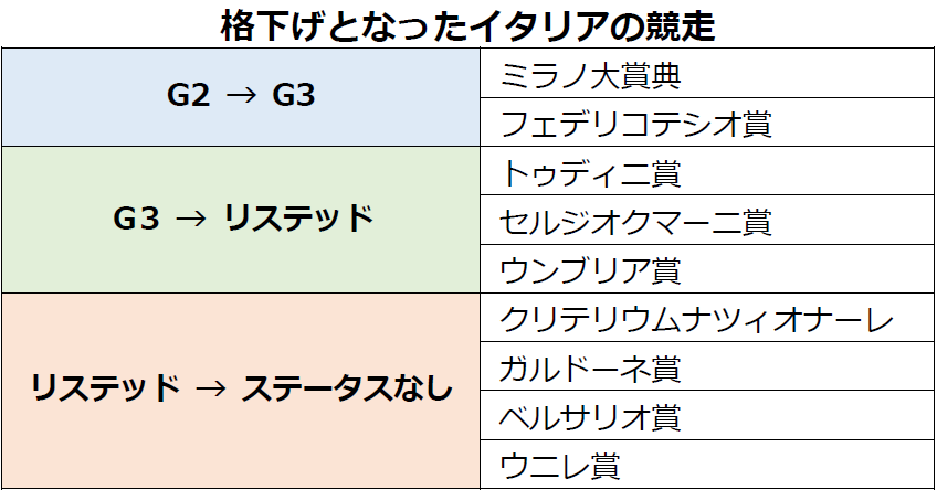 2月15日(水)に欧州の重賞競走11レースが格下げされたと発表された。そのうち5レースがイタリアの競走だった。また、イタリアは4つのリステッド競走を失った。