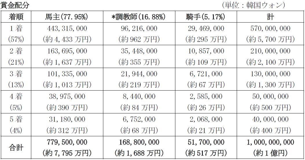 5.賞金は韓国ウォンで支払われ、関係各国の指定された馬主銀行口座に送金される。
