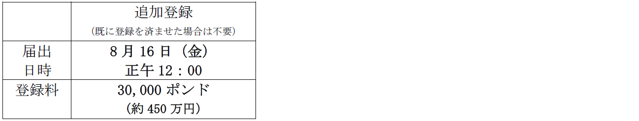 ※イギリスの競走登録を担当しているウェザビーズ社(Weatherbys Ltd) への登録後に、同社から登録料の請求書が届きます。出走までには、上記登録の合計4,375ポンド(約66万円)および通常約4万円【詳細は請求書に記載: 英国競馬統轄機構(BHA)の手数料、アニマルヘルストラスト(AHT)、引退競走馬福利基金、付加価値税、騎手登録料(保険・税込)など】が掛かります。