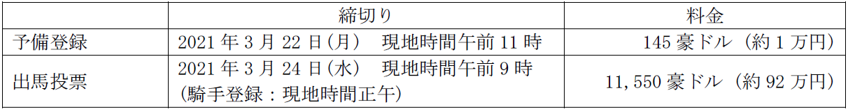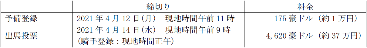 オーストラリアンダービーの1、2、3着馬は、出馬投票料を含む11,000豪ドルで、同競走に予備登録[4月5日(月)午後5時締切]ができる。