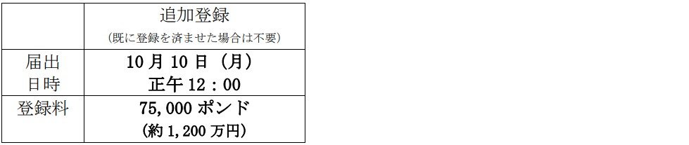 ※ イギリスの競走登録を担当しているウェザビーズ社(Weatherbys Ltd) への登録後に、同社から登録料の請求書が届きます。出走までには、上記登録の合計15,000ポンド(約240万円)および通常約4万円【詳細は請求書に記載: 英国競馬統轄機構(BHA)の手数料、アニマルヘルストラスト(AHT)、引退競走馬福利基金、付加価値税、騎手登録料(保険・税込)など】が掛かります。