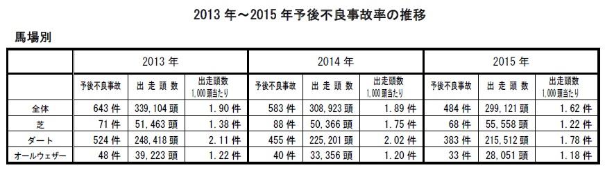 予後不良事故率は、オールウェザーで出走頭数1,000頭当たり1.18件、芝馬場で1.22件、ダート馬場で1.78件であり、すべての馬場で前年と比較して低下した。なお、ダート馬場において2件を下回るのは初めてのことである。