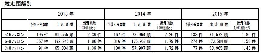 2015年の統計によれば、競走距離別の予後不良事故率も2009年から一貫した傾向を示している。中距離(6ハロン~1マイル)や長距離(1マイル超)のレースと比較し、短距離(6ハロン未満)レースの事故率は相変わらず高めである。