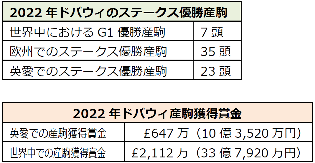 2022年のドバウィ産駒の獲得賞金総額が過去最高となることは、レーシングポスト・レーティング(RPR)のより詳細な種牡馬分析によってもお墨付きが与えられていた。RPR80以上(138頭:72%)、RPR 100以上(57頭:30%)、RPR 115以上(15頭:8%)とほぼすべての指標でリードし、さらに1歳セリでの牡駒・牝駒の平均価格と中間価格でも首位に立っていた。
