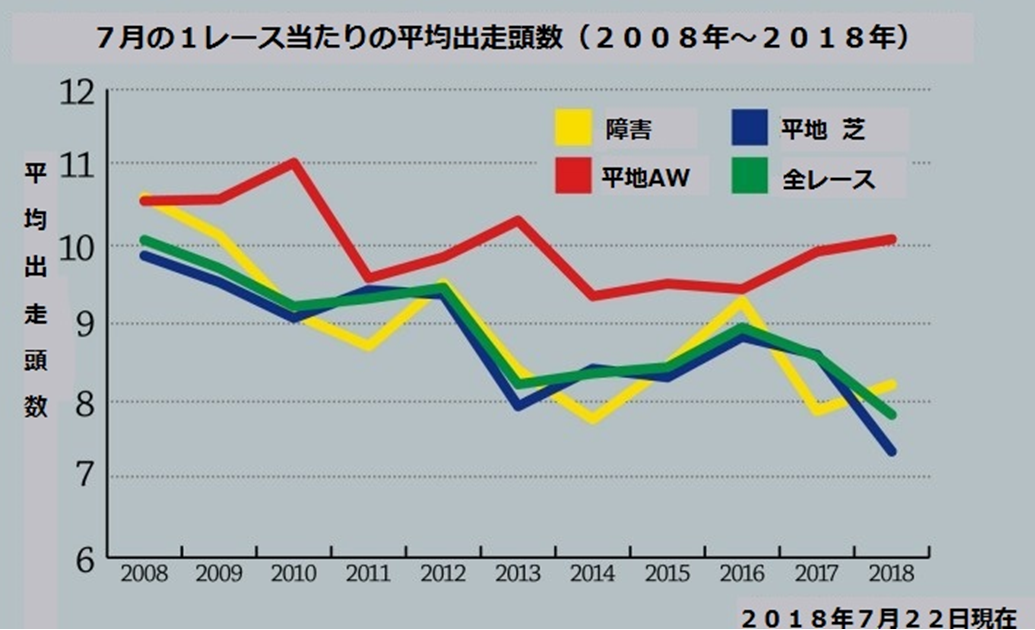 平地の芝レースに限ればわずか7.36頭であり、2017年7月の8.60頭から大幅に減少している。一方、オールウェザーは2013年以来最多の10.08頭、障害は2017年の7.88頭を上回る8.22頭である。