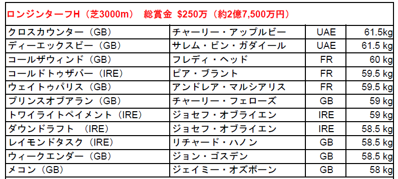 2018年メルボルンカップ(G1)優勝馬クロスカウンター(Cross Counter チャーリー・アップルビー厩舎)は、英ダービー(G1)・ゴールドカップ(G1)・グッドウッドカップ(G1)で2着となり堅実なキャリアを積むディーエックスビー(Dee Ex Bee)とともに、総賞金250万ドル(約2億7,500万円)のロンジンターフH(芝3000m)でトップハンデを背負うことになる。これらの馬の負担重量はフランスのG1馬コールザウィンド(Call The Wind フレディ・ヘッド厩舎)よりも1.5kg重い。