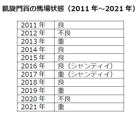 凱旋門賞は過去10回のうち6回は「重」あるいはさらに悪い馬場で施行されたが、過去20回では「良」での開催は11回にのぼる。