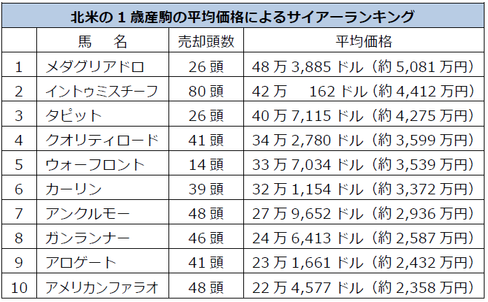 本誌(ブラッドホース誌)は北米の1歳産駒の平均価格によるサイアーランキングを以下のようにまとめた。これにより、1歳産駒の平均価格が40万ドル超の種牡馬は3頭、30万ドル超の種牡馬は6頭、16万ドル超の種牡馬は16頭いることが明らかになった。